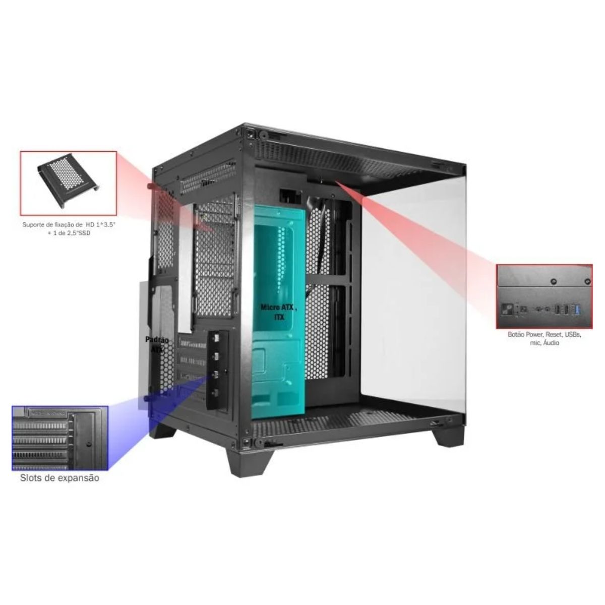 O K-MEX CG-0830 é compatível com placas-mãe , Micro-ATX e ITX, e conta com uma grande variedade de opções de conectividade, incluindo portas USB 3.2 e 2.0, além de uma entrada para fones de ouvido e microfone.